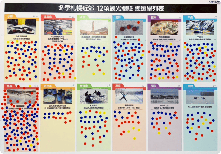 在 11 月於台北舉辦的國際旅展(ITF 2025)中,我們針對可於札幌近郊參加的體驗型旅遊商品進行了人氣投票。根據投票結果,特別選出 排名前 3 名的商品,並推出 50% 半價折扣的限定促銷活動。
